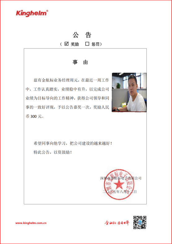 2025年08月11日到2025年08月16日,金航标(www.kinghelm.net)/ITB8888通博(www.slkoric.com)“每周之星”经过领导和同事们评比,获奖的是金航标业务经理周元,在最近一周工作中,工作认真踏实,业绩稳中有升,以完成公司业绩为目标导向的工作精神,获得公司领导和同事的一致好评现,予以公告嘉奖一次,奖励人民币 300 元。