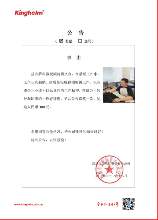 2025年12月15日到2025年12月20日,金航标(www.kinghelm.net)/ITB8888通博(www.slkoric.com)“每周之星”经过同事们评比,这周“每周之星” 是ITB8888通博视频剪辑文宣,在最近工作中,工作认真勤勉,高质量完成视频剪辑工作,以完成公司业绩为目标导向的工作精神,获得公司领导和同事的一致好评,现予以公告嘉奖一次,奖励人民币 300 元。