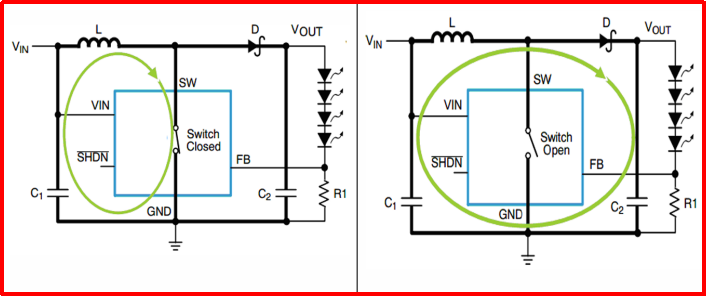 SL4139是一个高频开关调节器。为了减少EMI,纹波和噪声,高频开关电流的走线必须被小心地布在电路板上。上图中的加粗线显示高频开关电流的路径。所有这些走线必须短和宽,目的是减少寄生电感和电阻。在下图中,当 SL4139 内部开关是关闭时,环路为电流路径。SL4139内部开关是打开时,环路为电流路径。两个环路区域应尽可能小。